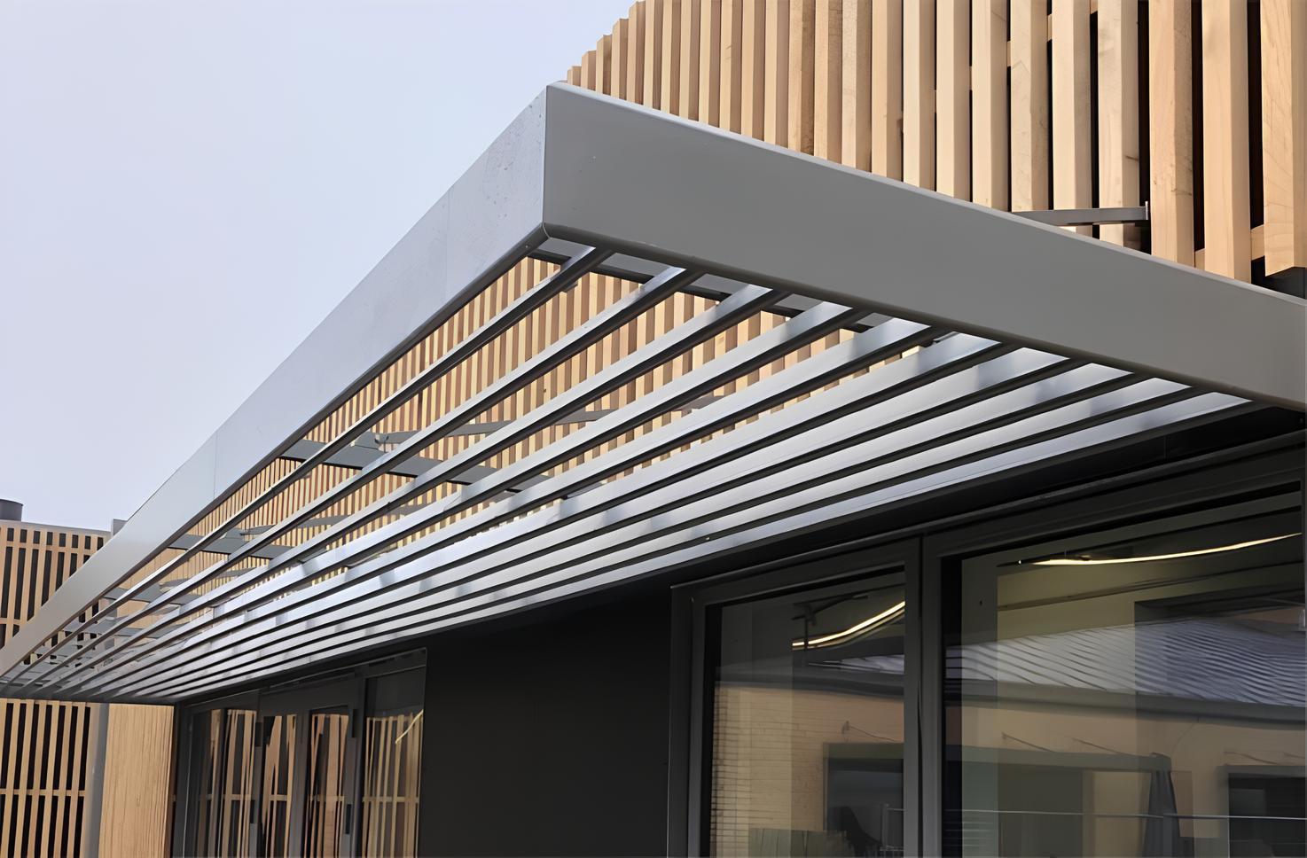 Lamelafskærmning er en funktionel samt vind- og vejrstabil løsning, der smukt bidrager til bygningens arkitektoniske udtryk.